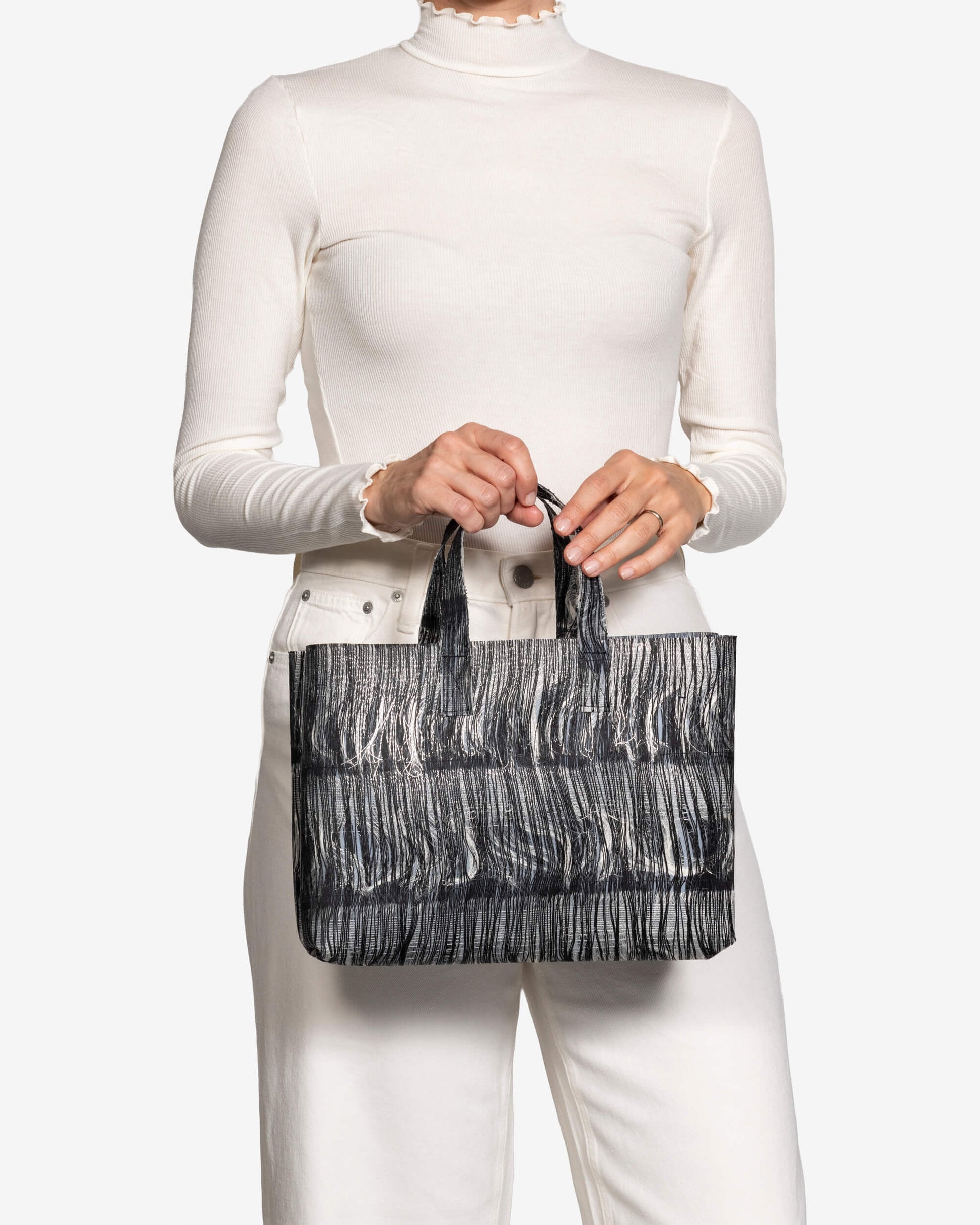 Small tote bag in handwoven selvedges, with short handles and a zipped inside pocket. The perfect size to carry your essentials from day to night.