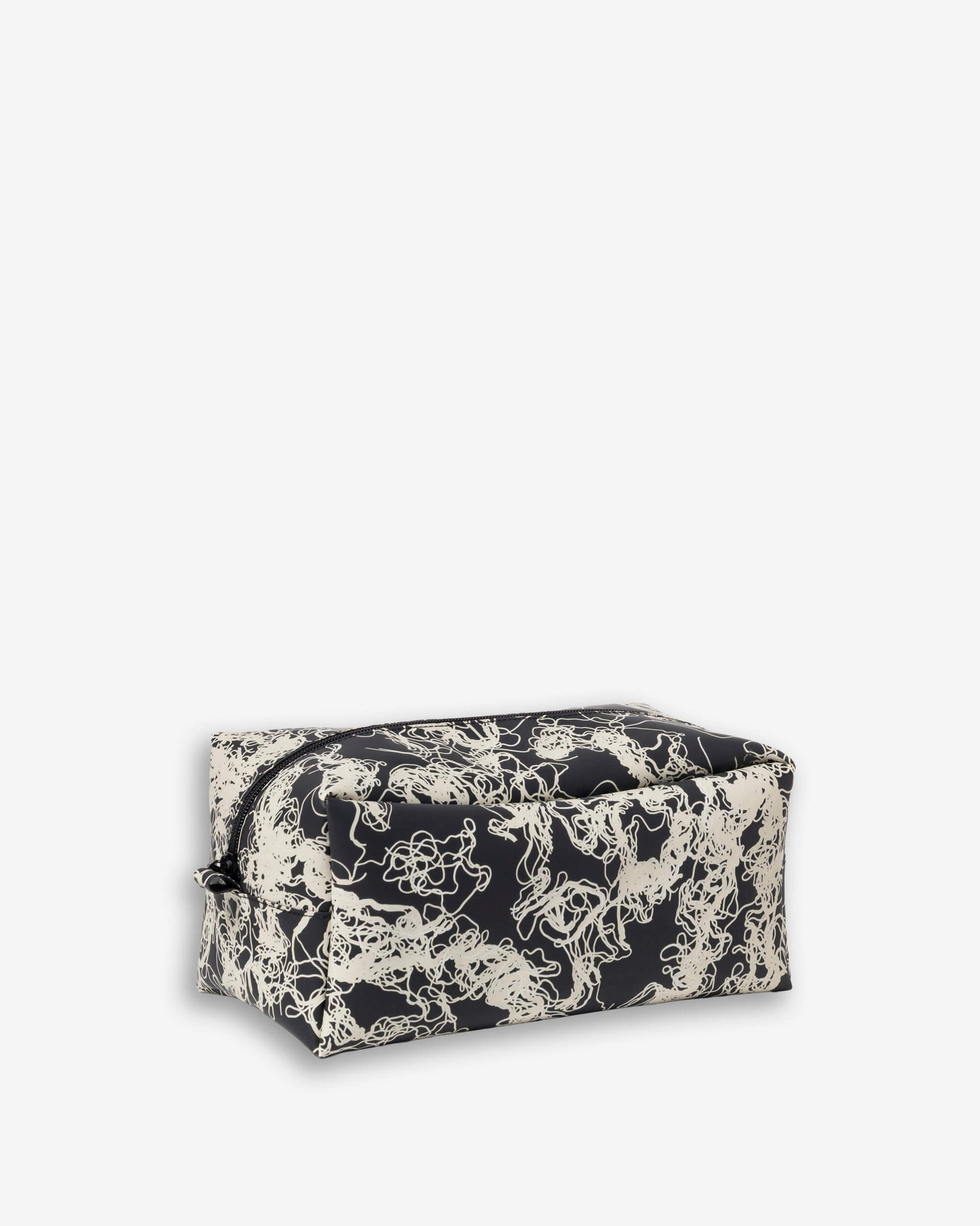 Large shaving bag in ivory scribble on black. The perfect travel companion, it's lightweight and water resistant.