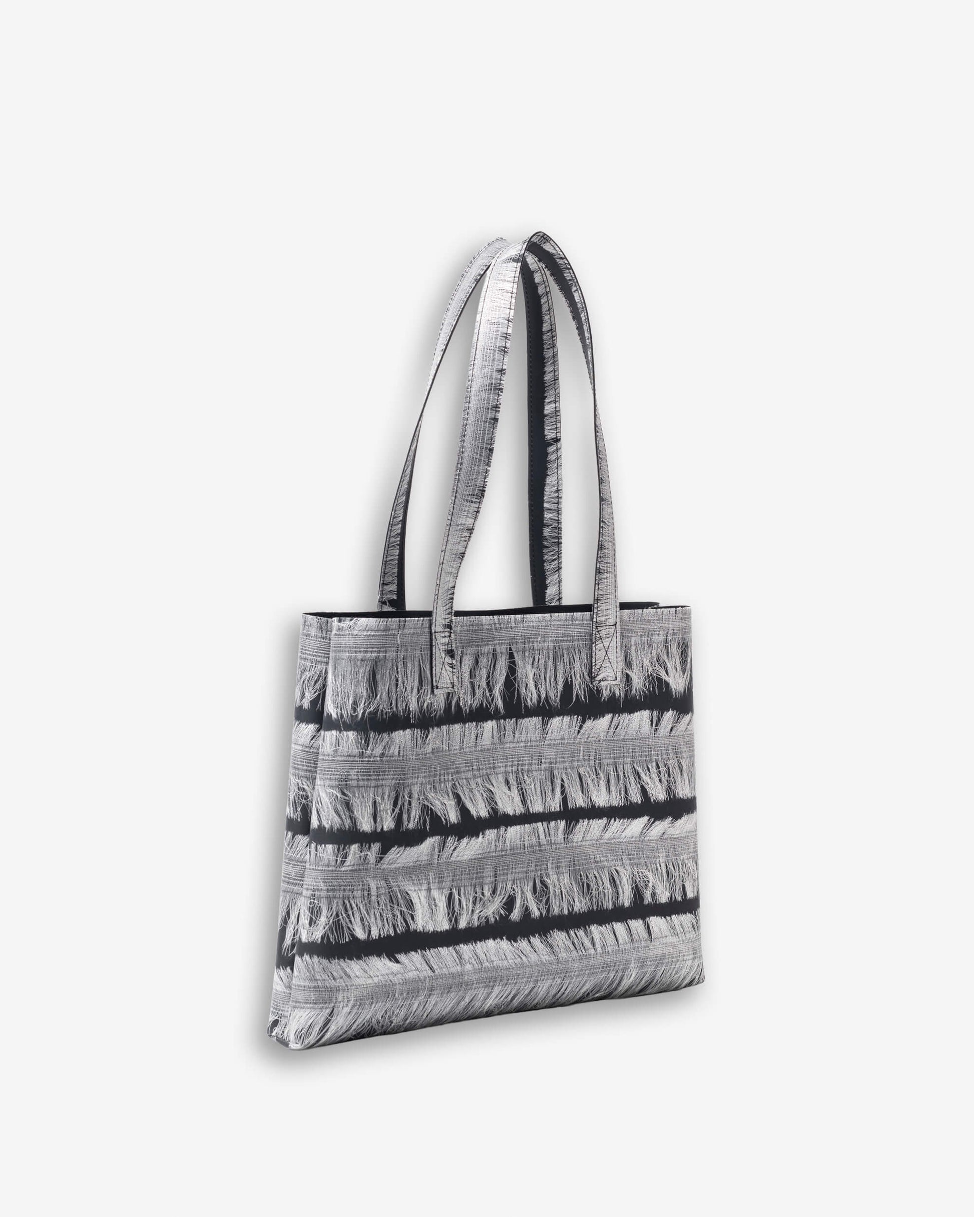 Tote bag with shoulder handles in silver fringes on black.